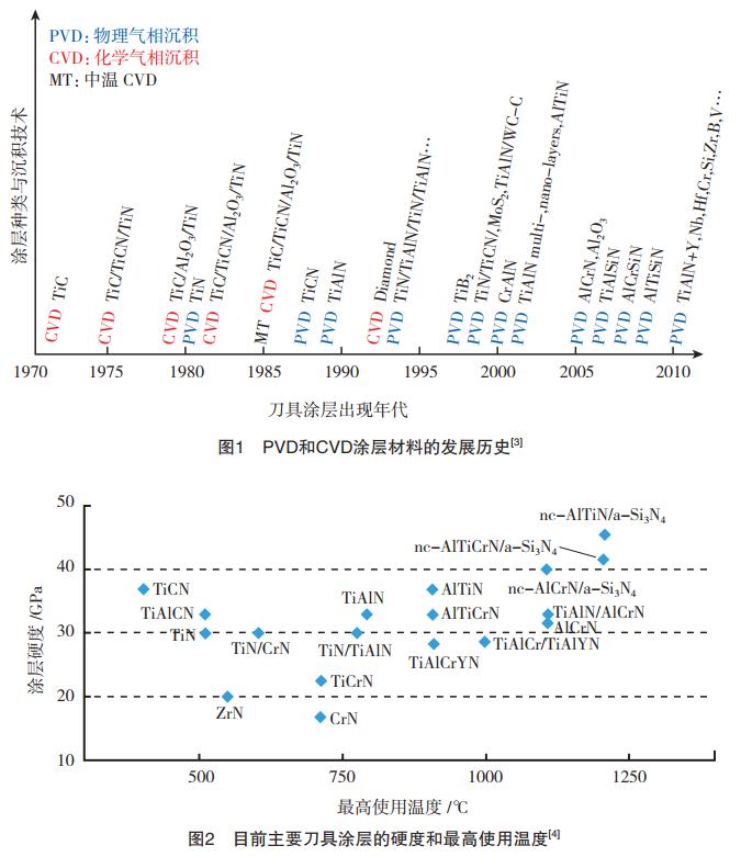 刀具表面的硬質涂層對材料有以下要求:(1)硬度高、耐磨性好;(2)化學性能穩定,不與工件材料發生化學反應;(3)高溫抗氧化性和熱穩定性高,在高溫下還能保持高硬度和長期穩定性;(4)與基體結合強度高,摩擦系數低。因此適合做刀具涂層的材料主要是過渡金屬的氮化物和碳化物(TiN、TiC、CrN等),此外還有一些共價鍵化合物(金剛石、BN等)和離子鍵化合物(Al2O3)。TiC和TiN是最早出現的刀具涂層材料。TiC涂層抗磨料磨損能力強,具有高的抗刀面磨損和抗月牙洼磨損能力;TiN涂層摩擦系數小,應用溫度高于TiC,適于加工鋼材或切削易于粘在前刀面上的材料。隨著現代高速高效加工和難加工材料日益增多對刀具材料的苛刻要求,TiC和TiN涂層的硬度和抗高溫能力已滿足不了加工需要。刀具涂層材料不斷升級更新,經歷了簡單二元涂層(TiN、TiC)→三元或四元固溶涂層(TiAlN、TiCN、TiAlCN等)→多層或超晶格結構涂層(TiN/TiC/TiN多層、多層、TiN/AlN超晶格等)→納米復合結構涂層(TiSiN、等)的發展,涂層的硬度和最高使用溫度不斷提高。圖1和圖2總結了近年來出現的新型涂層和涂層性能的發展。