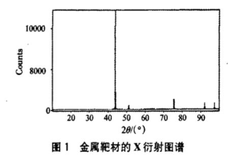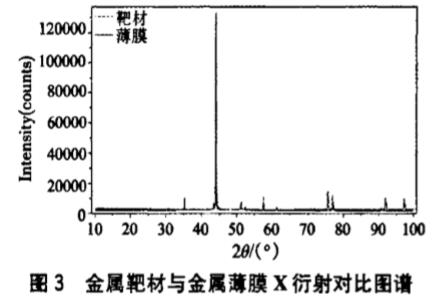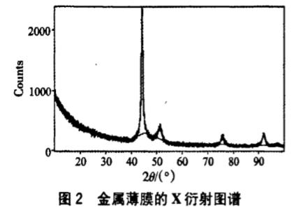 由圖1靶材衍射峰半高寬計算可得靶材晶粒尺寸D2為47.6nm。由此可以得出結(jié)論,薄膜晶面衍射峰寬化是PVD薄膜晶粒細(xì)小的原因之一。而用磁控濺射法制備出的薄膜晶粒尺寸小于金屬靶材晶粒尺寸,這是因?yàn)榇趴貫R射法制備薄膜時,真空室中溫度較低,基片未經(jīng)過加熱處理,使達(dá)到基底表面的金屬粒子動能減小,在基底表面上凝結(jié),只能得到很小的晶粒甚至得到無定形薄膜。