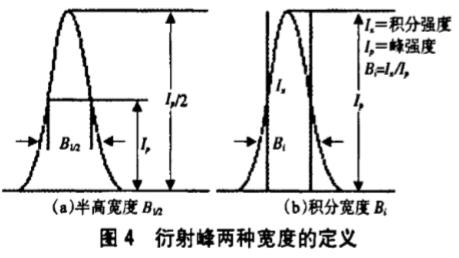 可求得晶粒在垂直(hkl)面方向的尺度D。K與晶粒形狀、分布等有關(guān),但通常取值為1(或0.9),λ為X射線波長,θ為Bragg角,B為衍射峰的半高寬,以弧度為單位。B的測算方法常用方法如下,見圖4。