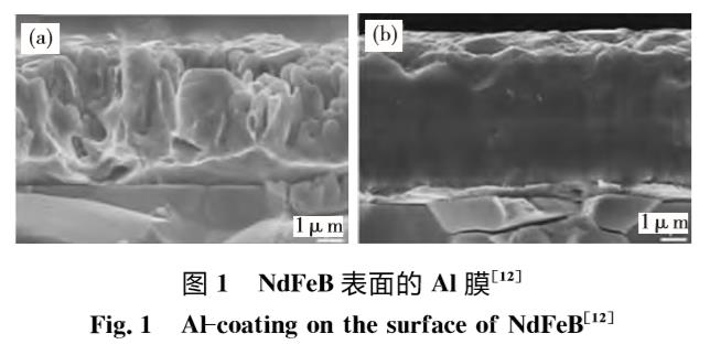 MaoSD等采用直流磁控濺射技術在NdFeB上沉積Al膜,得到呈柱狀晶結構的Al薄膜,如圖1(a)所示。研究表明,磁控濺射鍍鋁提高了磁體的耐腐蝕性能;由于鍍鋁層柱狀晶間的微孔貫穿薄膜,因此帶有Al防護鍍層的Nd-FeB材料腐蝕時,腐蝕液會通過這些微孔到達基體。MaoSD等又采用了離子束輔助磁控濺射(Ion-beam-assisteddeposition,IBAD)的方法在NdFeB表面制備了Al膜,見圖1(b),可以看出柱狀晶結構消失,膜層更加均勻和致密,結果表明,經240h中性鹽霧試驗后,磁控濺射的純Al薄膜表面出現大面積的紅銹,但IBAD制備的Al膜表面只有少量的紅銹,其耐蝕性能明顯提高,這主要是由于IBAD-Al膜層中存在更多致密的氧化膜。MaoSD等也采用等離子體輔助磁控濺射法制備了Al/Al2O3多層膜。