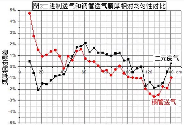 其2中,銅管送氣是氣體從銅管的一端進(jìn)入,從銅管上均勻開的多個(gè)小孔流出進(jìn)入真空室,由于從進(jìn)氣端到末端氣體被小孔流出形成壓強(qiáng)漸小,小孔流出的氣體也逐漸減少,形成不均勻送氣;二進(jìn)制送氣是將氣體均勻的一路分為二路,二路均分為四路,如此均分為多路后送入真空室,可認(rèn)為是均勻送氣。觀察對(duì)比圖中曲線可知二進(jìn)制送氣情況下,影響膜厚不均勻的主要是磁場(chǎng),銅管送氣的情況下,膜厚的分布,在磁場(chǎng)影響的基礎(chǔ)上,疊加了一個(gè)斜率。這個(gè)斜率,正好和銅管送氣產(chǎn)生的壓強(qiáng)梯度相符。壓強(qiáng)大的地方,膜較厚,相反較薄。根據(jù)形成不均勻送氣的原理可以推知,膜層厚度的變化斜率可能和小孔的密度,大小和送氣壓力有關(guān),基本關(guān)系大概是和小孔密度、大小成正比,和送氣壓力成反比。