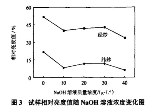 從圖3可以看出,堿減量預處理之后鍍膜,試樣經、緯紗相對亮度值范圍分別為34.0%~42.9%、6.2%~11.8%,均低于普通水洗試樣的51.7%、21.8%,說明堿減量處理對改善鈦膜耐磨性和提高膜基結合牢度有利。鈦膜耐磨性隨NaOH溶液濃度變化有所不同,且經、緯紗變化趨勢基本一致。由圖3可知,隨NaOH溶液質量濃度提高,試樣相對亮度先緩慢上升,在30g/L后又有所下降,即鈦膜耐磨性先減小、后增加。