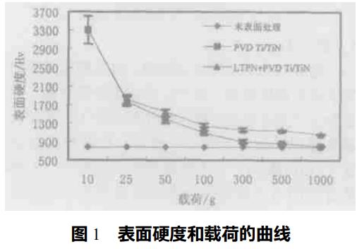 ?。?)在Cr12MoV鋼上沉積Ti/TiN涂層能顯著地提高Cr12MoV鋼的表面硬度及承載能力。而且,先進行低溫等離子氮化處理的雙重處理更能改善涂層-基體結合條件,顯著提高涂層與基體的結合強度,這歸因于Ti/TiN涂層強化和韌化的作用以及中間氮化層的強化作用。