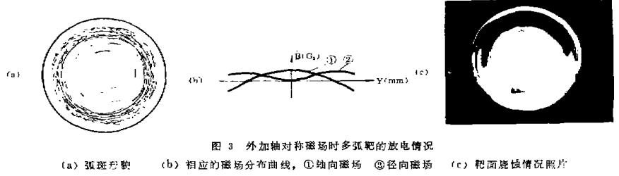 當(dāng)靶面處加一相對于靶面軸對稱的磁場時,堆團(tuán)狀弧斑消失,弧斑在靶面上繞靶軸心作旋轉(zhuǎn)運動,形成幾條微細(xì)的弧環(huán)。這種情況下的放電穩(wěn)定性較好(參見圖3)。在陰極靶面上,弧斑位置受磁場控制,靶面處電弧燃燒比較穩(wěn)定的地方也就是磁場最強的地方。