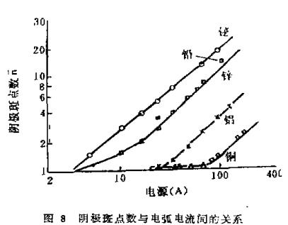 多弧靶源的真空電弧放電其電弧電流是由靶面上的陰極弧斑提供的,對某一材質(zhì)的陰極靶來說,陰極斑點上所能承受的電流值是一定的,表1列出了不同陰極材料陰極斑點的平均電流值。陰極斑點數(shù)與電弧電流值成正比。隨著電弧電流的增加,陰極斑點的數(shù)目也增加,且相互獨立的運動。圖8給出了幾種材料的陰極斑點數(shù)與陰極電弧電流間的關(guān)系曲線。假定因某種原因造成某個弧斑熄滅,但其余的弧斑仍然正常燃燒并很快分裂恢復(fù)原來的電流值和弧斑數(shù)目,使電弧得以穩(wěn)定燃燒。所以電弧電流越大,電弧斑點數(shù)就越多,滅弧的可能性就越小。