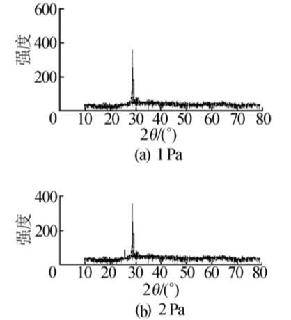 從圖1可以看出,2種氣壓下所制備的TiO2薄膜都在2θ=28°左右出現強烈的衍射峰,通過與資料對比,可以判斷TiO2薄膜的晶型為金紅石,與理論是相符的。另外26°時的尖峰是襯底反射產生的。同時可以判斷出在2Pa時,濺射的結晶程度高一些,但與1Pa相比差別不大。
