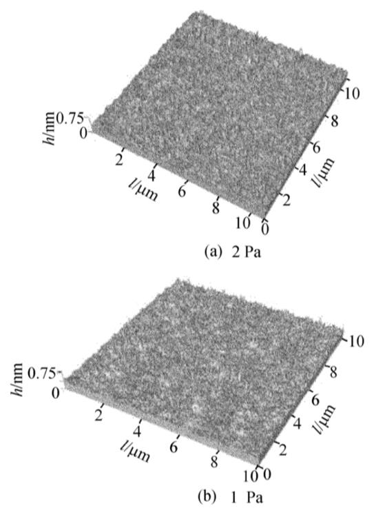 2種氣壓下制備的TiO2薄膜的二維及三維AFM圖如圖2和圖3所示。