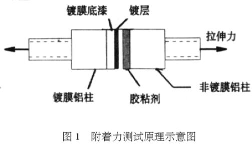 2.1 鍍層附著力測(cè)試方法鍍膜后的鋁柱經(jīng)膠粘劑對(duì)粘后,將鋁柱另一端的螺紋與材料拉伸試驗(yàn)機(jī)的拉伸卡頭相接,通過(guò)測(cè)試對(duì)粘鋁柱的拉伸強(qiáng)度,分兩種情況來(lái)考察附著力的大小(見(jiàn)圖1):