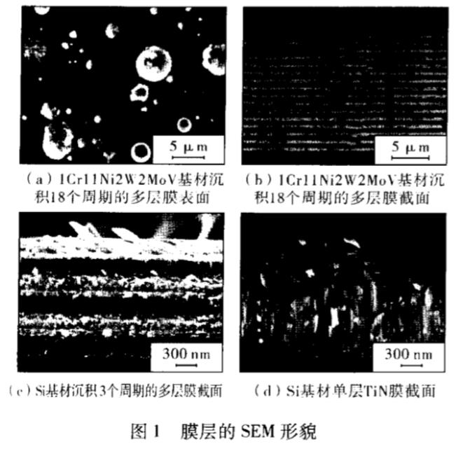 圖1a是1Crl1Ni2W2MoV基材上沉積18個(gè)周期的Ti/TiN/Zr/ZrN多層膜的表面形貌,可以看出:多層膜的表面較為平整、致密;膜層表面分布有一些色淺、大小不等的球形顆粒,這是陰極電弧離子鍍沉積工藝存在的“液滴”造成的。圖1b是1Crl1Ni2W2MoV基材上沉積18個(gè)周期的Ti/TiN/Zr/ZrN多層膜的截面形貌,可以看到:Ti/TiN/Zr/ZrN4層結(jié)構(gòu)為1個(gè)周期,截面顯示有18個(gè)周期,每個(gè)周期厚0.8um左右,總膜約厚15um,其中暗處為Ti/TiN層,亮處為Zr/ZrN層;同時(shí)有液滴的痕跡,大的可以貫穿幾個(gè)周期的膜厚。采用多層結(jié)構(gòu)可以將液滴包覆,這對(duì)提高膜層的耐腐蝕性非常重要。圖1c是Si片上沉積3個(gè)周期的多層膜截面形貌,可以看出:多層膜在1個(gè)周期內(nèi),層與層之間界面明晰,各層薄膜呈柱狀生長(zhǎng)方式。在多層膜調(diào)制周期中,金屬層的存在會(huì)阻斷氮化合物層柱狀晶的生長(zhǎng),從而限定晶粒的生長(zhǎng)。圖1d是Si片上沉積2h得到的TiN單層薄膜截面形貌,可以看出:對(duì)于單層TiN薄膜,隨著沉積時(shí)間的增加,細(xì)小的晶粒合并成大的晶粒,并以柱狀的方式生長(zhǎng)。與圖1d相比,圖1c中的多層膜由于采用多層結(jié)構(gòu),金屬層的插入有效地阻斷了柱狀晶的進(jìn)一步長(zhǎng)大,達(dá)到了細(xì)化晶粒、減少穿透性針孔的作用。