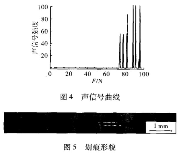 圖4為Ti/TiN/Zr/ZrN多層膜的聲信號(hào)曲線。由圖4可以看出,多層膜與基體結(jié)合良好,結(jié)合力超過70N。圖5為劃痕的形貌,與圖4相對(duì)應(yīng),當(dāng)壓頭在試樣表面從左到右勻速滑動(dòng)時(shí),在劃痕的末端,膜層開始脫落,此時(shí)產(chǎn)生聲信號(hào)。
