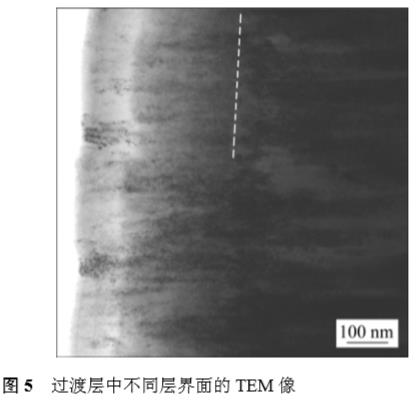圖5所示為較高分辨率下CrN層與CrTiAlN層之間界面的TEM像(白線處)。由圖可知:界面不明顯,反映出層間的良好結合,由于CrN與CrTiAlN的柱狀晶是錯開一定角度生長的,這對提高膜層的抗氧化性及耐腐蝕性起到很好的作用。