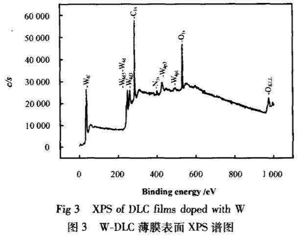 圖3所示為摻鎢類金剛石(W-DLC)薄膜的XPS譜圖可以看出:薄膜中除碳以外還存在鎢(含量為7.0at%),W4f的特征峰位于31.9eV處,大于w值31.4eV,小于WO2值32.8eV,而一般WC的處于31.5~32.8eV,可以判斷在非晶類金剛石薄膜中含有微晶WC相;同時薄膜中還含有少量氧及氮,估計是表面吸附污染所致,其梯度過渡層與Ti-DLC相同,只是最表層為W-DLC.在TC4基體上制備的薄膜厚度約2.83um,膜層硬度日HV0.1.25為8.78Pa(HV0.01.25=24.7GPa),膜/基結合力為60N。