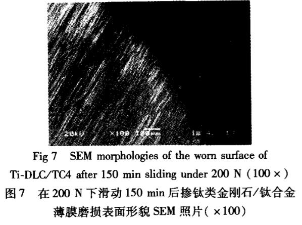 圖7所示為Ti-DLC/TCA薄膜在漸進加載(圖5上半部方式)至200N、保載滑行150min后(摩擦系數突變)的磨損表面局部形貌SEM照片可見:在磨痕表面粘著痕跡極少,以磨粒磨損為主,磨損區域與未磨損區界面為逐漸過渡,磨痕較淺,這主要是由于Ti-DLC/TC4薄膜/基較硬,承載能力較強,但膜層在較高載荷下,受膜/基結合強度不高及內應力的影響,摩擦-定時間后出現疲勞裂紋,繼而出現顆粒剝落而形成磨粒,導致磨粒磨損;而在局部磨損嚴重區域與偶件出現粘著現象,其原因是由于當局部接觸應力大于薄膜的承載能力時造成部分膜層“坍塌”或剝落,因此,Ti-DLC/TC4薄膜比TC4基底的磨損率和摩擦系數低、失效時間長。
