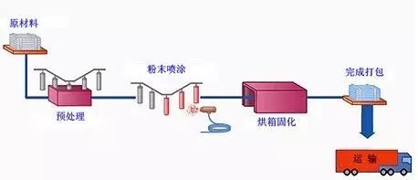 粉末噴涂:是用噴粉設備(靜電噴塑機)把粉末涂料噴涂到工件的表面,在靜電作用下,粉末會均勻的吸附于工件表面,形成粉狀的涂層;粉狀涂層經(jīng)過高溫烘烤流平固化,變成效果各異(粉末涂料的不同種類效果)的最終涂層。