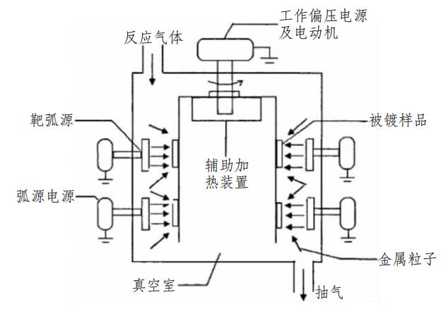 多弧離子鍍技術的工作原理主要基于冷陰極真空弧光放電理論。圖1為多弧離子鍍工作原理示意圖,點燃真空電弧后,陰極靶材表面上出現一些不連續、大小和形狀多樣、明亮的斑點,它們在陰極表面迅速地做不規則的游動,一些斑點熄滅時又有些斑點在其他部位形成,維持電弧的燃燒。陰極斑點的電流密度達104~105A/cm2,并且以1000m/s的速度發射金屬蒸氣,其中每發射10個電子就可發射1個金屬原子,然后這些原子再被電離成能量很高的正離子(如Ti+),正離子在真空室內運行時與其他離子結合(如與N-形成TiN),沉積在工件表面形成涂層。